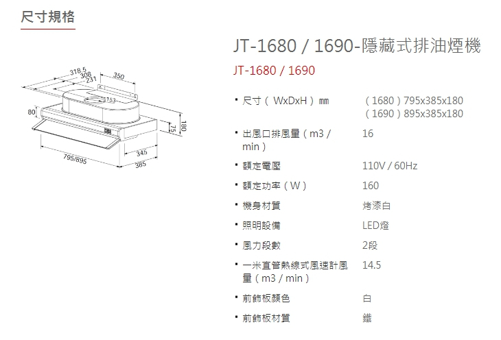 喜特麗 JT-1680/1690-隱藏式排油煙機