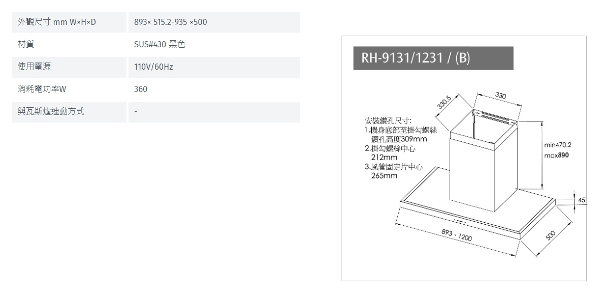 林內 Rinnai RH-9131(B) 倒T式高質感不銹鋼排油煙機