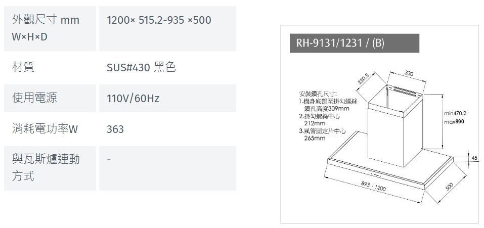 林內 Rinnai RH-1231(B) 倒T式高質感不銹鋼排油煙機