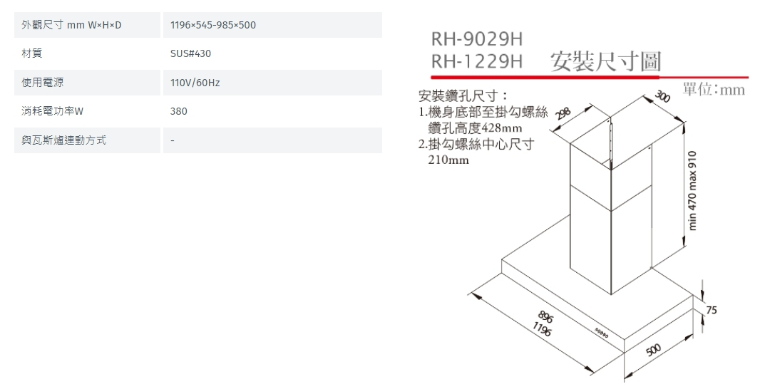 林內 Rinnai RH-1229H 倒T式高速馬達排油煙機