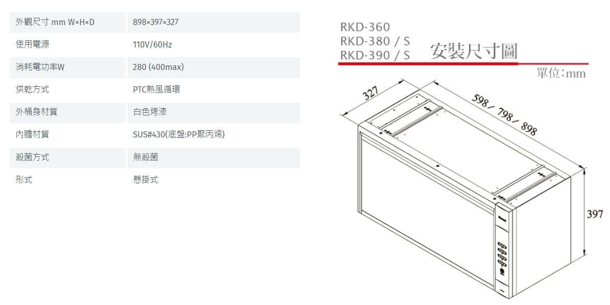 林內 RINNAI RKD-390(W) 懸掛式熱風循環烘碗機