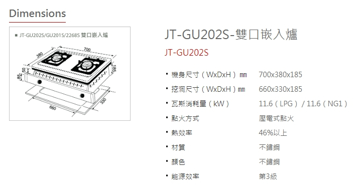 喜特麗 JT-GU202S 雙口不鏽鋼崁入爐