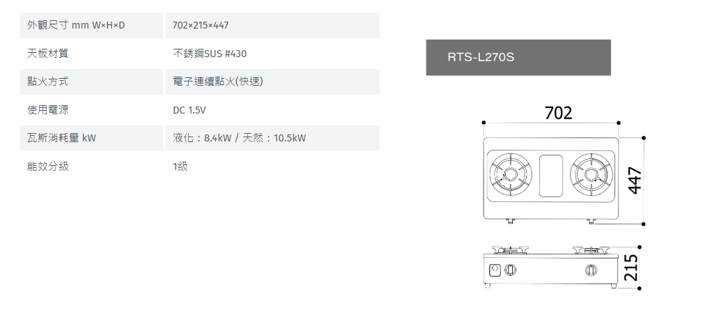 林內 Rinnai RTS-L270S 台爐式彩焱不鏽鋼雙口爐