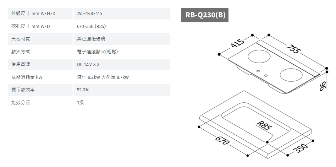 林內 Rinnai RB-Q230G(B) 檯面式感溫玻璃雙口爐