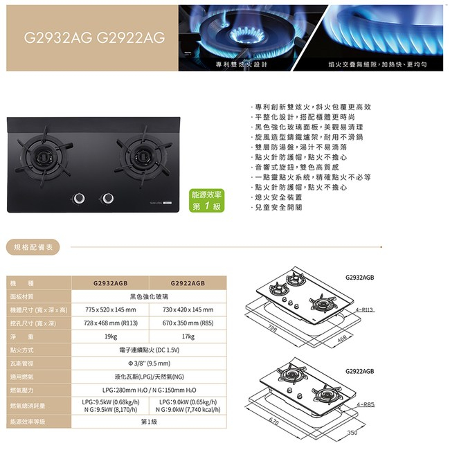 SAKURA 櫻花牌G2922AG 雙炫火強化玻璃檯面式二口瓦斯爐