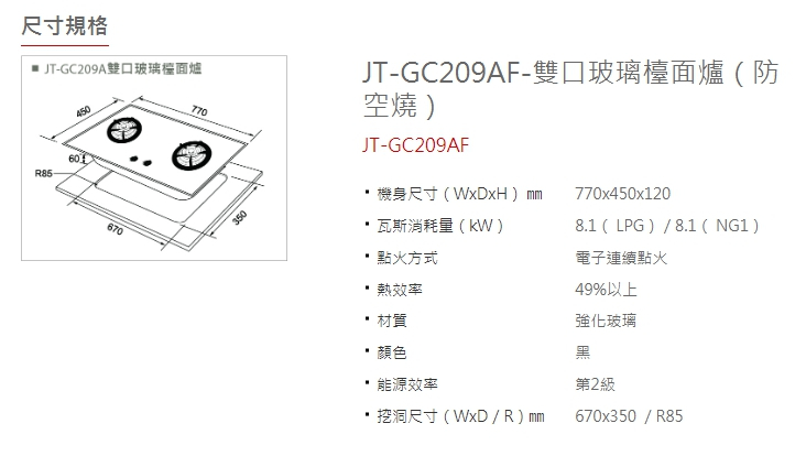 喜特麗JT-GC209AF-雙口玻璃檯面爐 黑/白