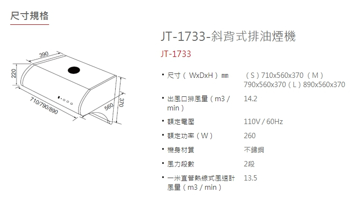 喜特麗 JT-1733 S/M/L -斜背式排油煙機