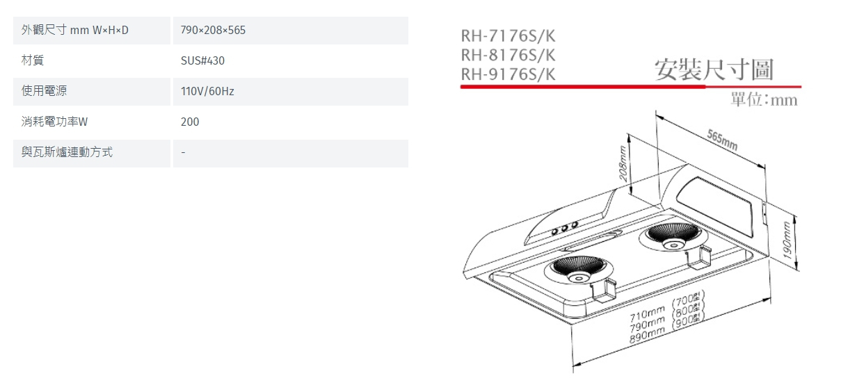 林內 Rinnai RH-8176S 圓弧式典雅輕巧排油煙機