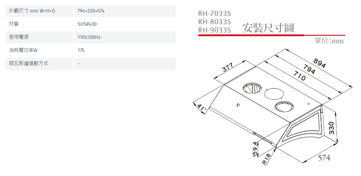 林內 Rinnai RH-8033S 深罩式水洗電熱除油排油煙機