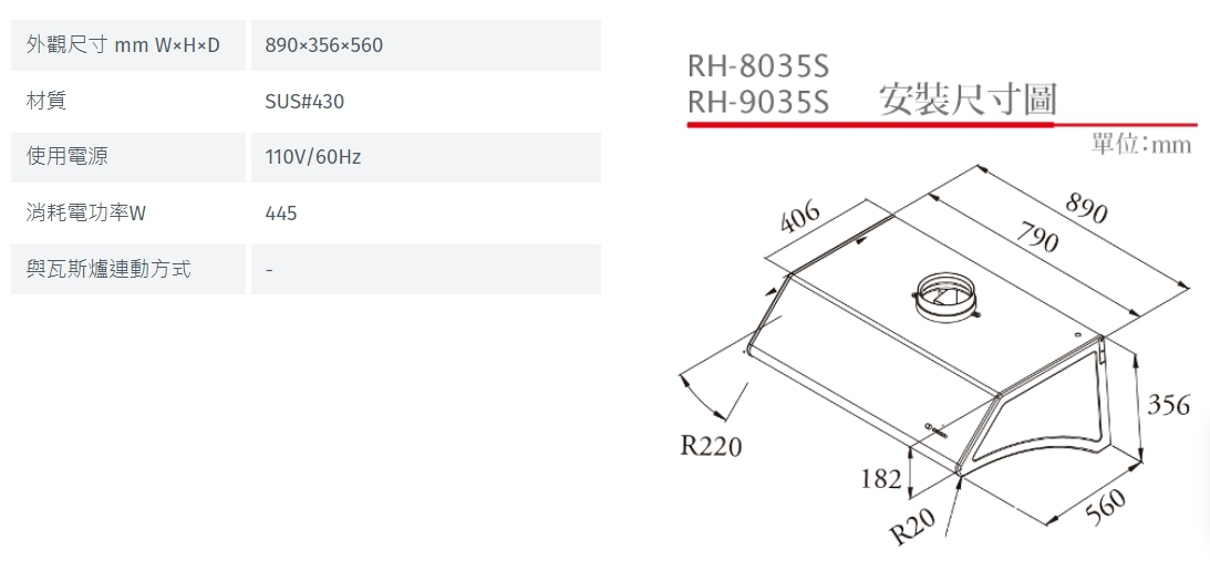 林內 Rinnai RH-9035S 深罩式高速馬達排油煙機