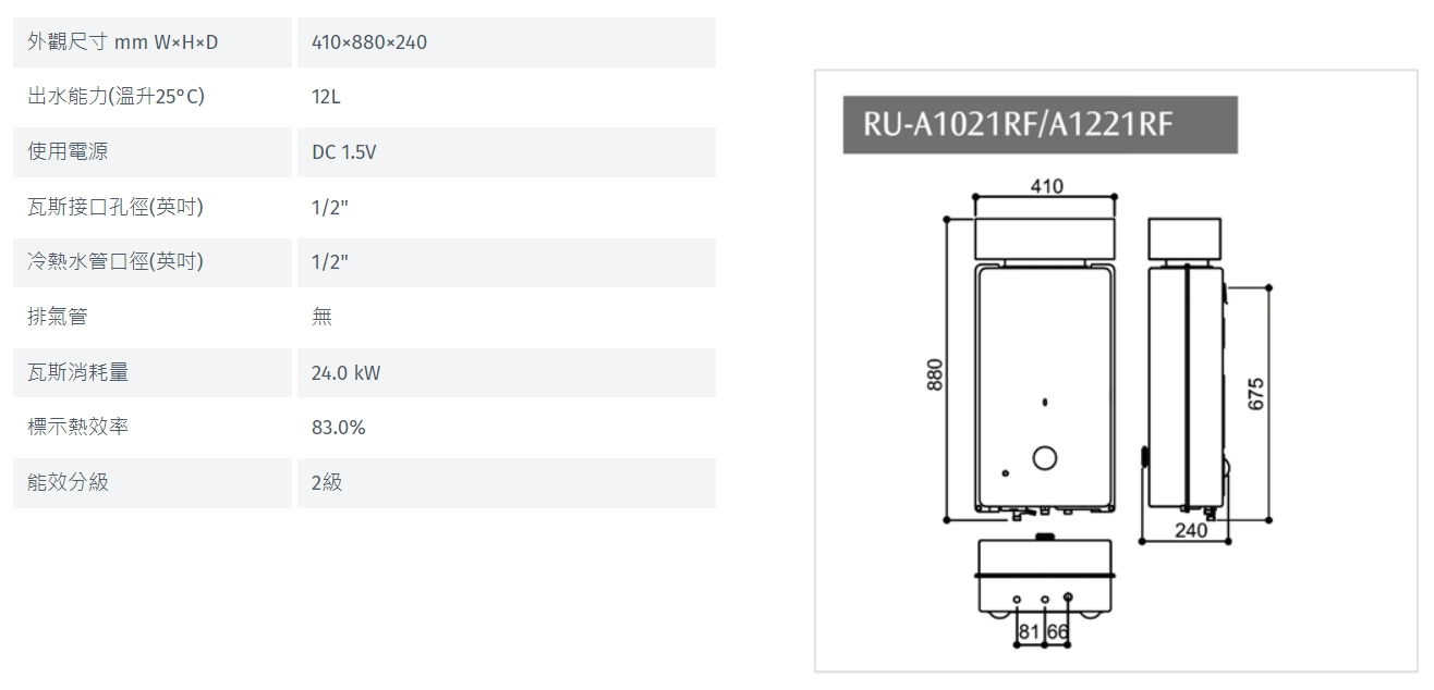 林內 Rinnai RU-A1221RF 屋外型12L自然排氣熱水器