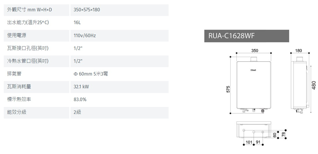 林內 Rinnai RUA-C1628WF 屋內型16L強制排氣熱水器
