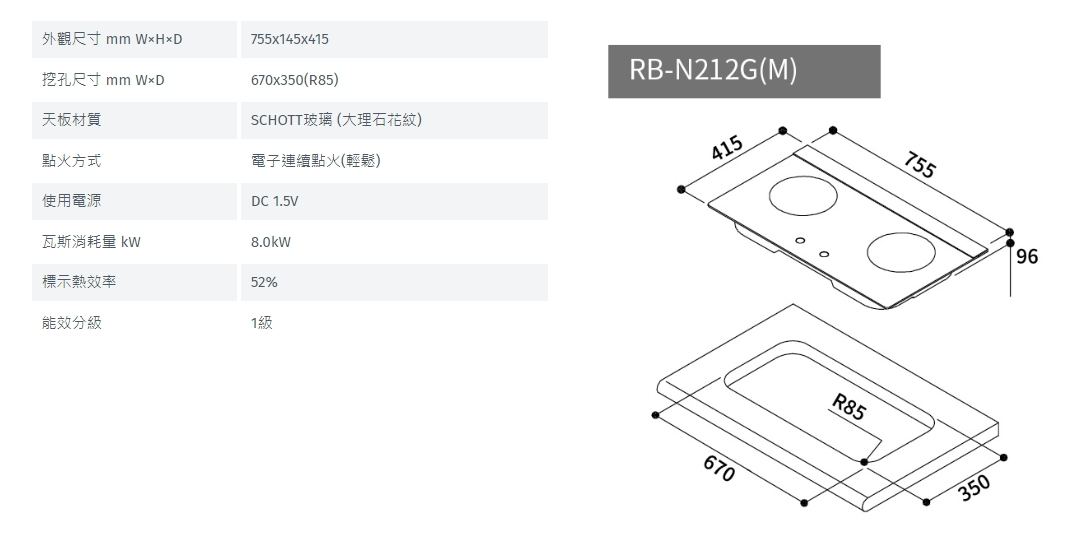 林內 Rinnai RB-N212G(M) 檯面式內焰玻璃雙口爐