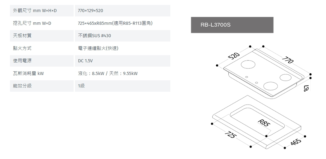 林內 Rinnai RB-L3700S(R) 檯面式彩焱不銹鋼三口爐