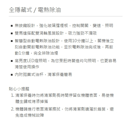 電熱除油功能,於電熱除油完成後,再啟動運轉1分鐘,將油煙排除