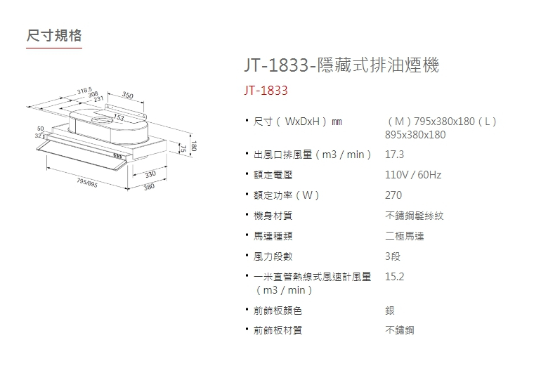 喜特麗 JT-1833M/L 隱藏式排油煙機(雙渦輪增壓)80公分
