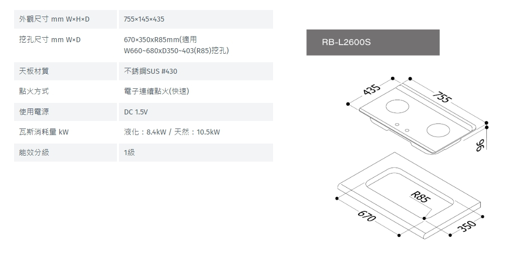 林內 Rinnai RB-L2600S 檯面式彩焱不銹鋼雙口爐