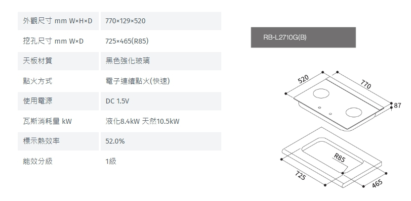 林內 Rinnai RB-L2710G(B) 檯面式彩焱玻璃雙口爐
