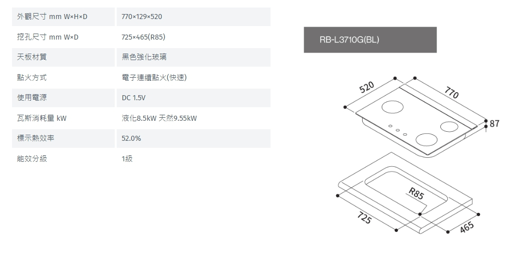 林內 Rinnai RB-L3710G(BL) 檯面式彩焱玻璃三口爐