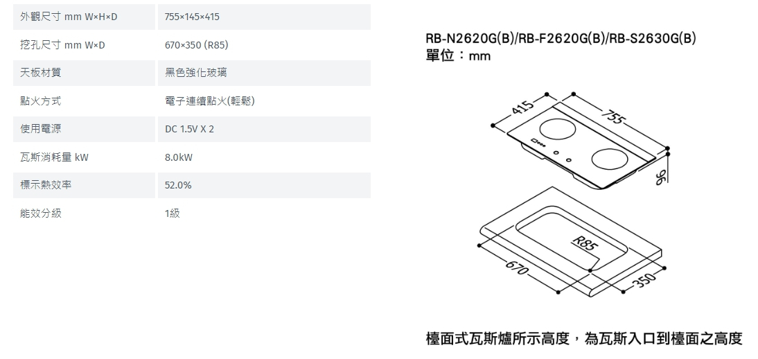 林內 Rinnai RB-N2620G(B) 檯面式內焰玻璃雙口爐