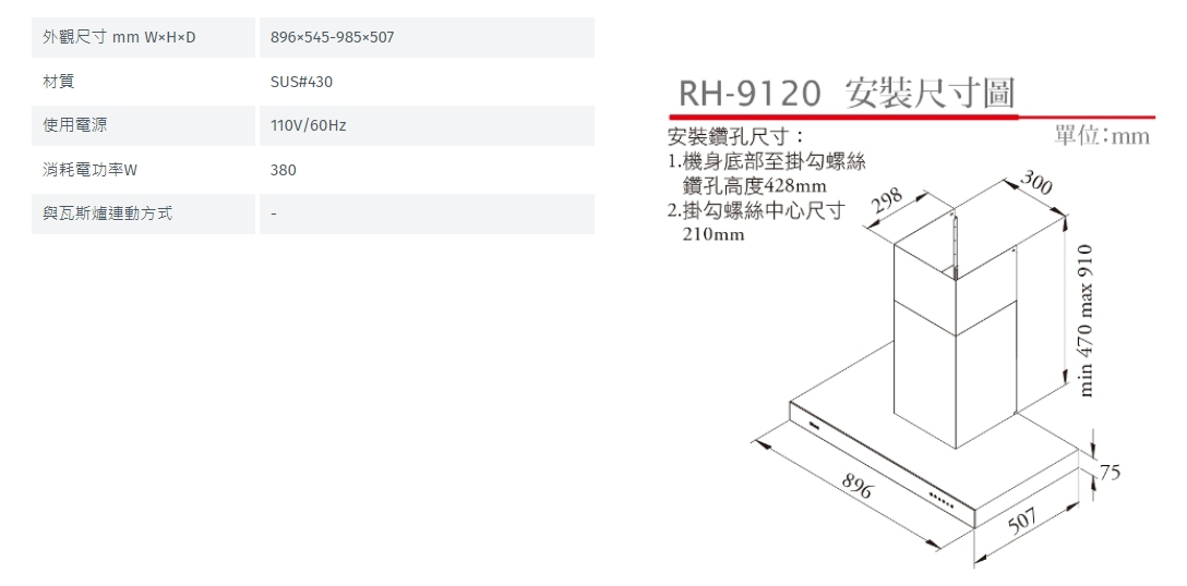 林內 Rinnai RH-9120 倒T式絕美設計高速馬達排油煙機