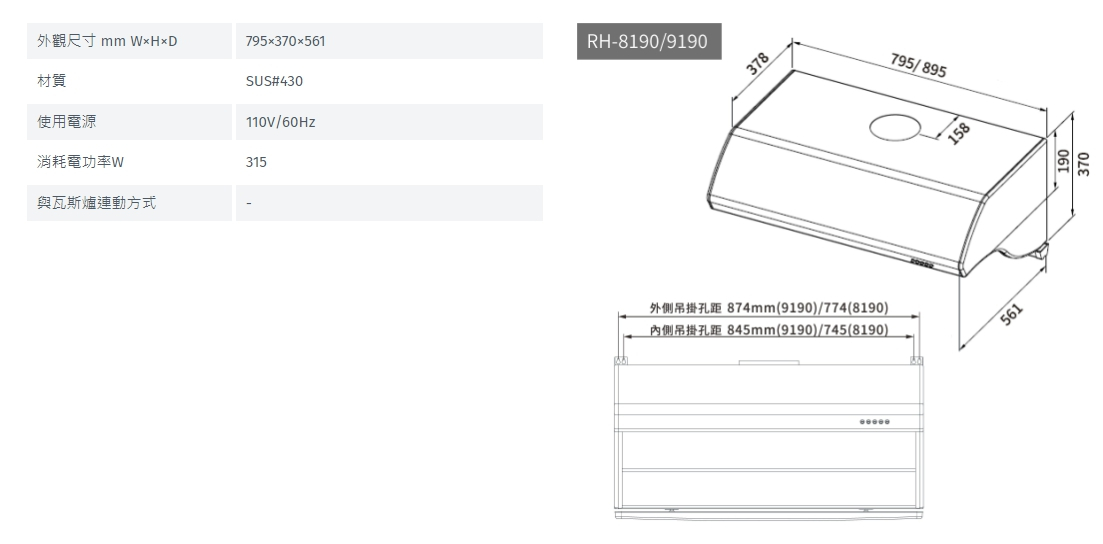 林內 Rinnai RH-8190 深罩式高速馬達排油煙機