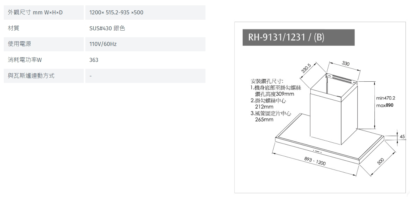 林內 Rinnai RH-1231 倒T式高質感不銹鋼排油煙機