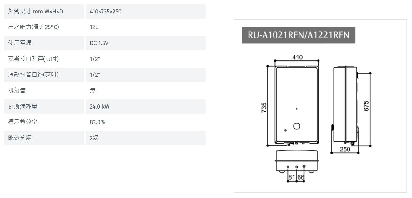 林內 Rinnai RU-A1221RFN 屋外型12L自然排氣熱水器